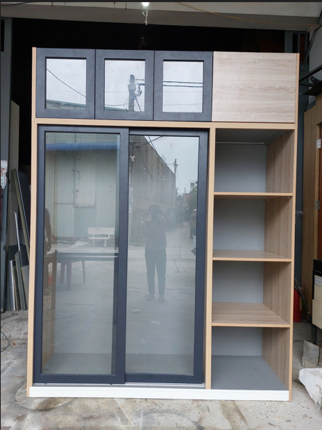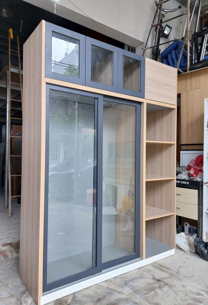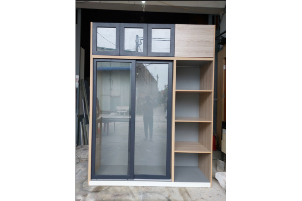 • Hai cánh trượt kính lớn – tiết kiệm diện tích khi mở tủ.