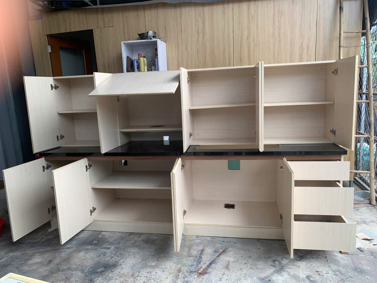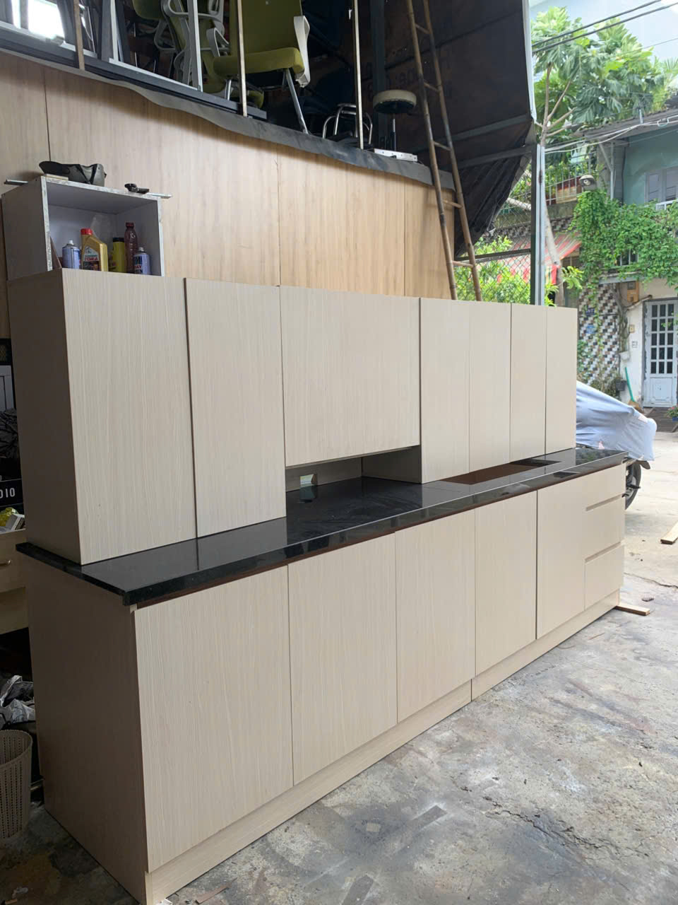 Cần thanh lý tủ bếp gỗ công nghiệp MDF phủ melamine, màu vân gỗ sáng hiện đại, thiết kế gồm cả tủ trên và tủ dưới đầy đủ công năng: